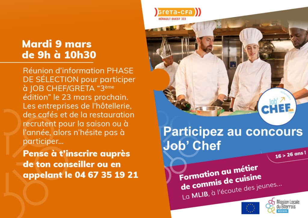 Une réunion d’information PHASE DE SELECTION pour participer à JOB CHEF/GRETA “troisième édition” aura lieu le 9 mars prochain de 9h à 10h30