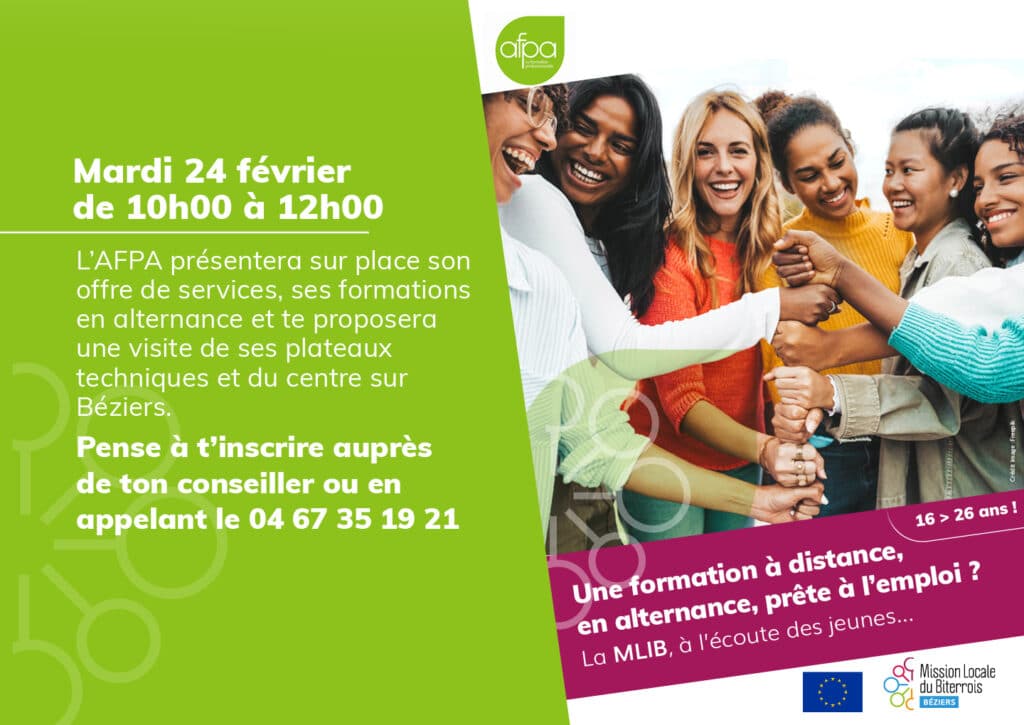 L’AFPA présentera sur place son offre de services, ses formations en alternance et te proposera une visite de ses plateaux techniques et du centre sur Béziers le mardi 24 février de 10h à 12h.