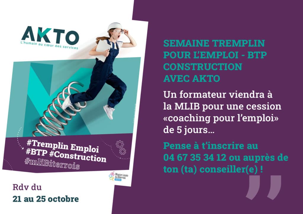Du 21 au 25 octobre aura lieu semaine TREMPLIN pour l’emploi – BTP Construction à la MLIB avec notre partenaire AKTO.