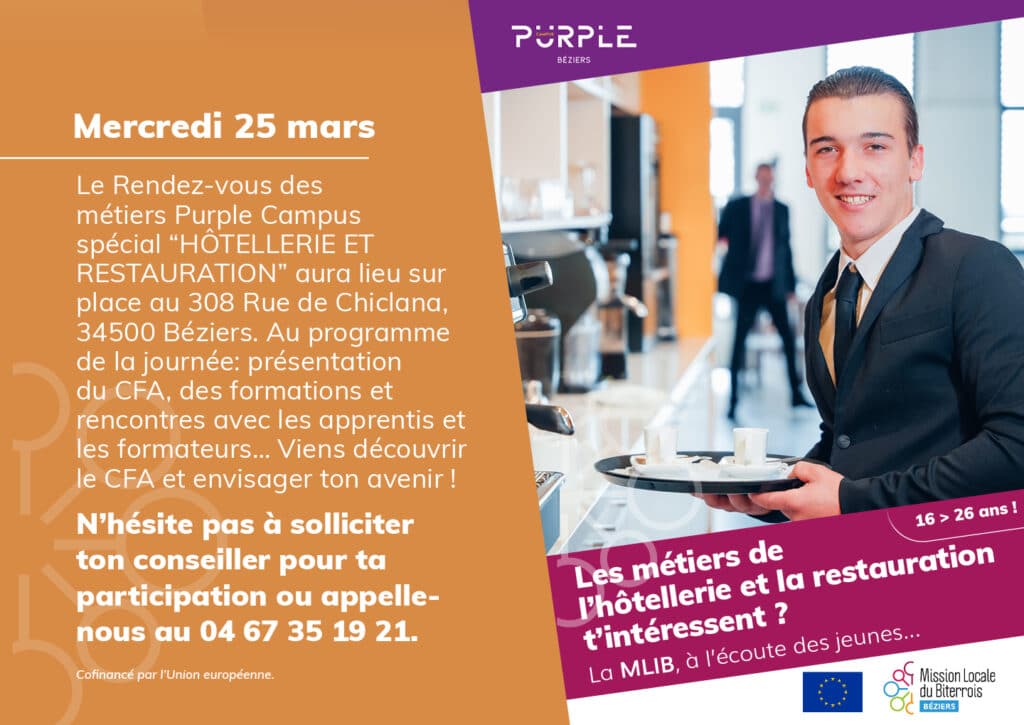 Le RDV DES METIERS Purple Campus spécial “Hôtellerie et Restauration” est fait pour toi ! Il aura lieu le mercredi 25 mars sur place au 308 Rue de Chiclana, 34500 Béziers. Au programme de la journée : présentation du CFA, des formations et rencontres avec les apprentis et les formateurs… Viens découvrir le CFA et envisager ton avenir !